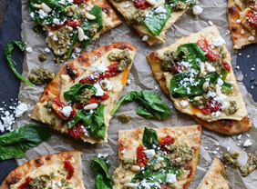 Hummus Flatbread With Sun-Dried Tomatoes, Spinach, and Pesto